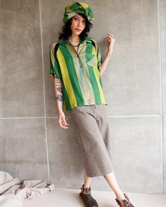 W'MENSWEAR BOWLING SHIRT - GREEN STRIPE