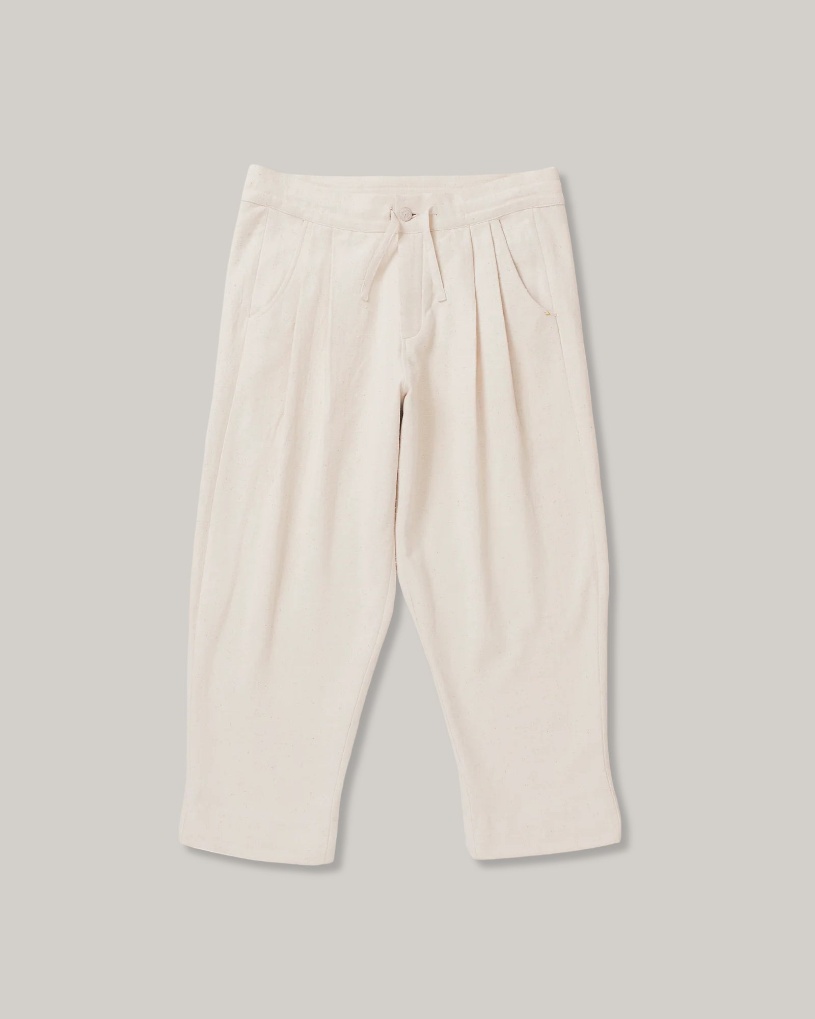 A comfort-driven pair of trousers having a slight elasticated waistband and wide legs. Crafted with undyed handspun and hand-woven basket weave organic cotton. Ecru is the color of the unbleached fabric, filled with all those tiny grains of loveliness. Handspun yarn is made using a single spindle Gandhi charkha.
