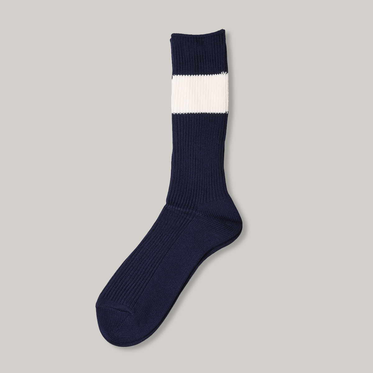 Chunk block colour crew sock with a chunky thick contrasting stripe up to contrast.