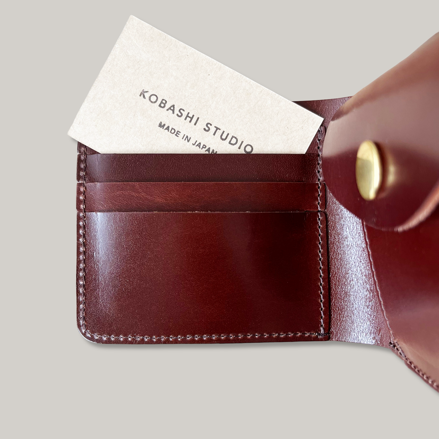 Bill fold wallet. Main bill pocket, four card slots and coin pocket with made-in-Japan brass button.