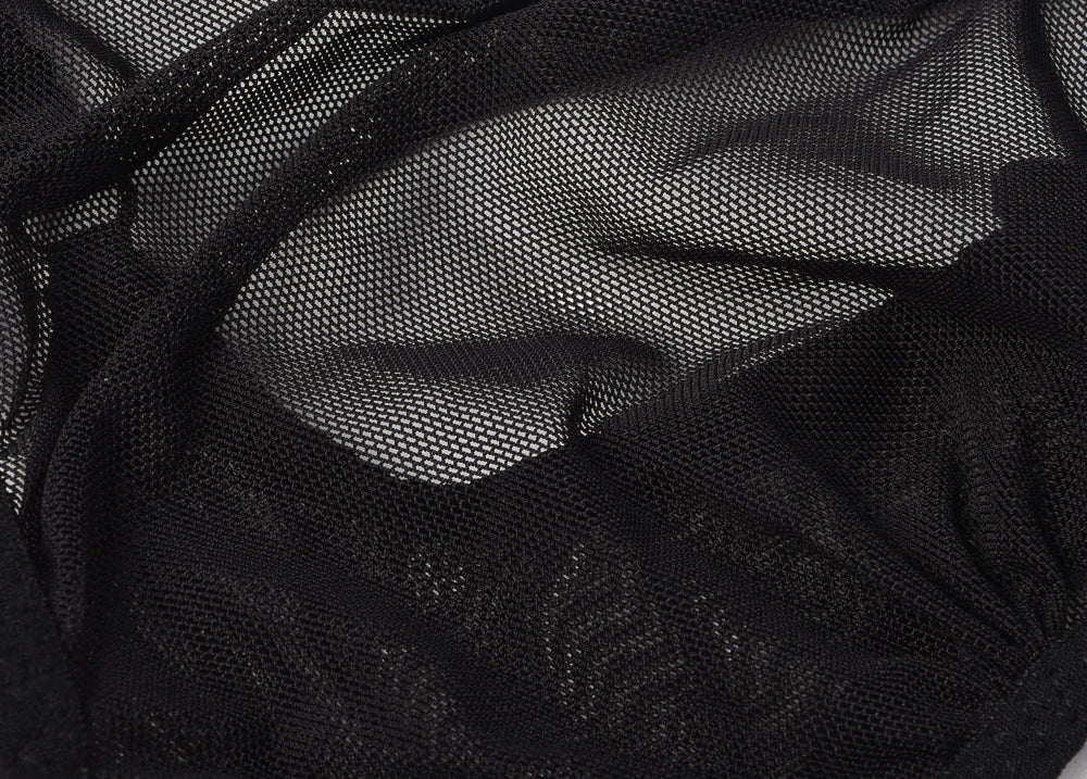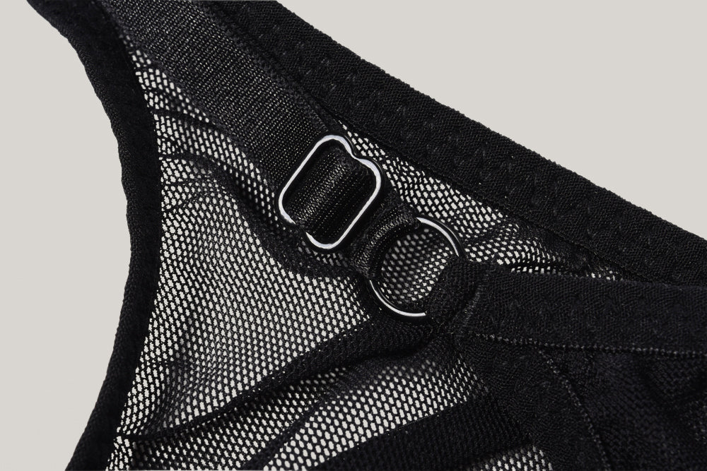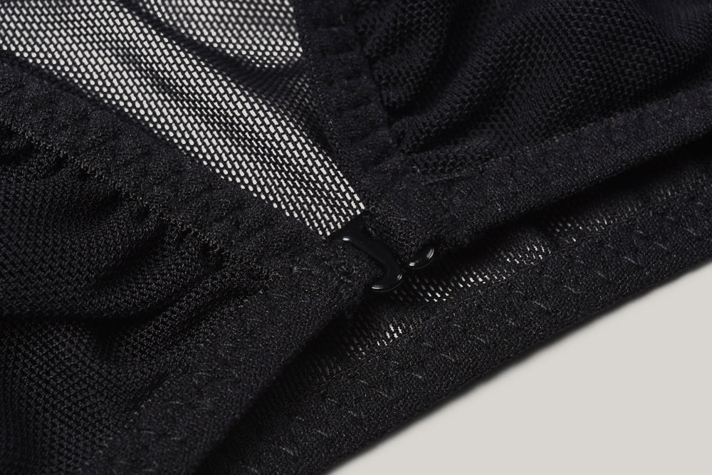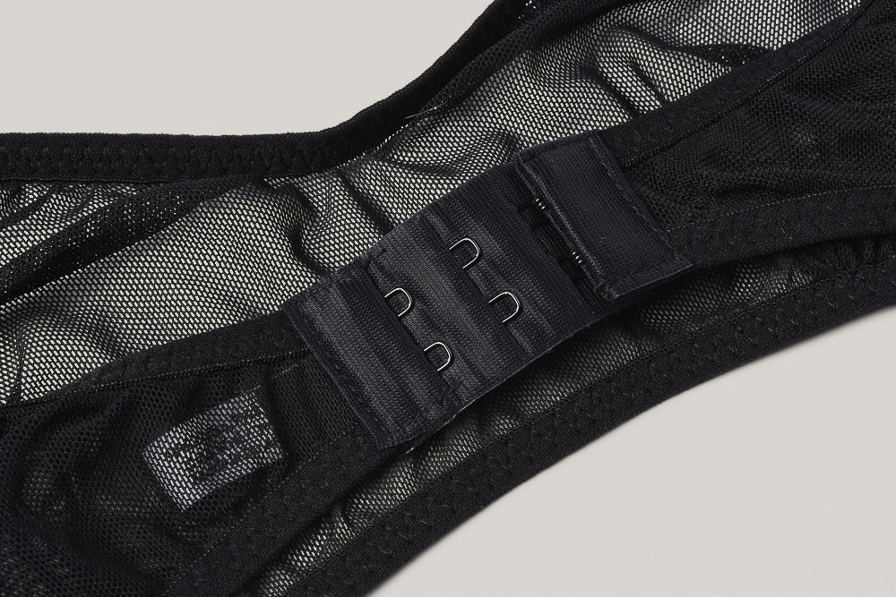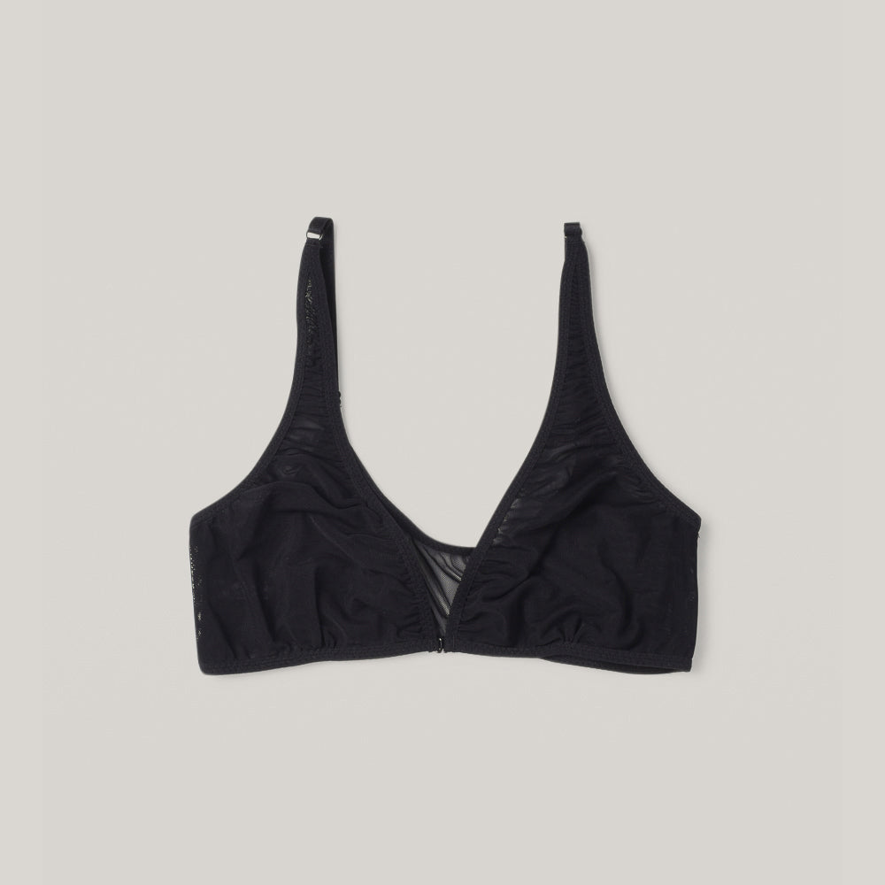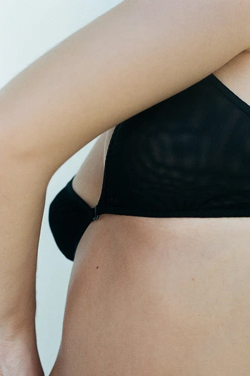 Front-closure bra featuring a double layer of premium deadstock mesh sourced from warehouses in Los Angeles. A dramatic plunge slopes toward a silver hook while adjustable straps provide gentle, wireless support. Inspired by the quietude of being underwater, and considered for everyday movement and rest.