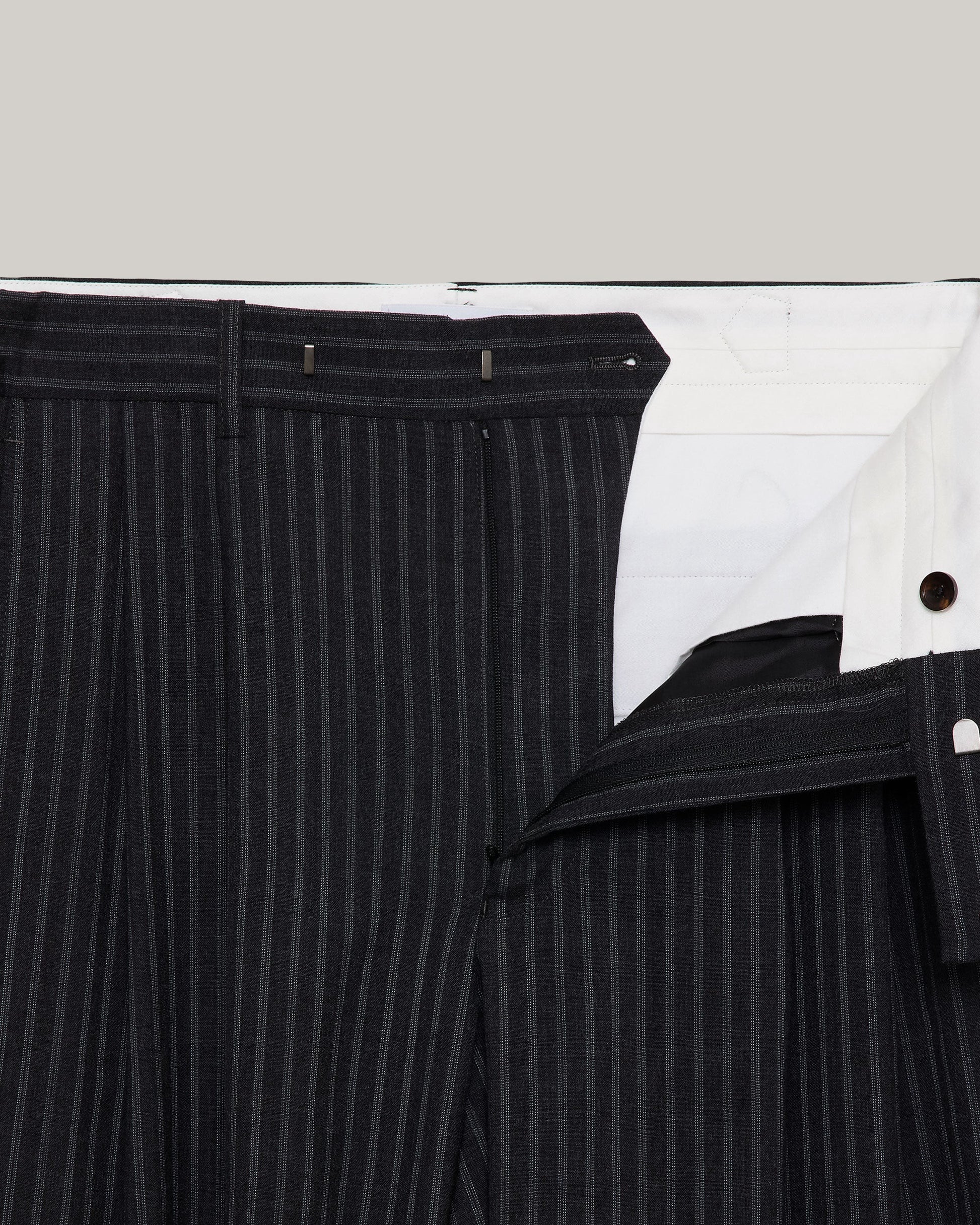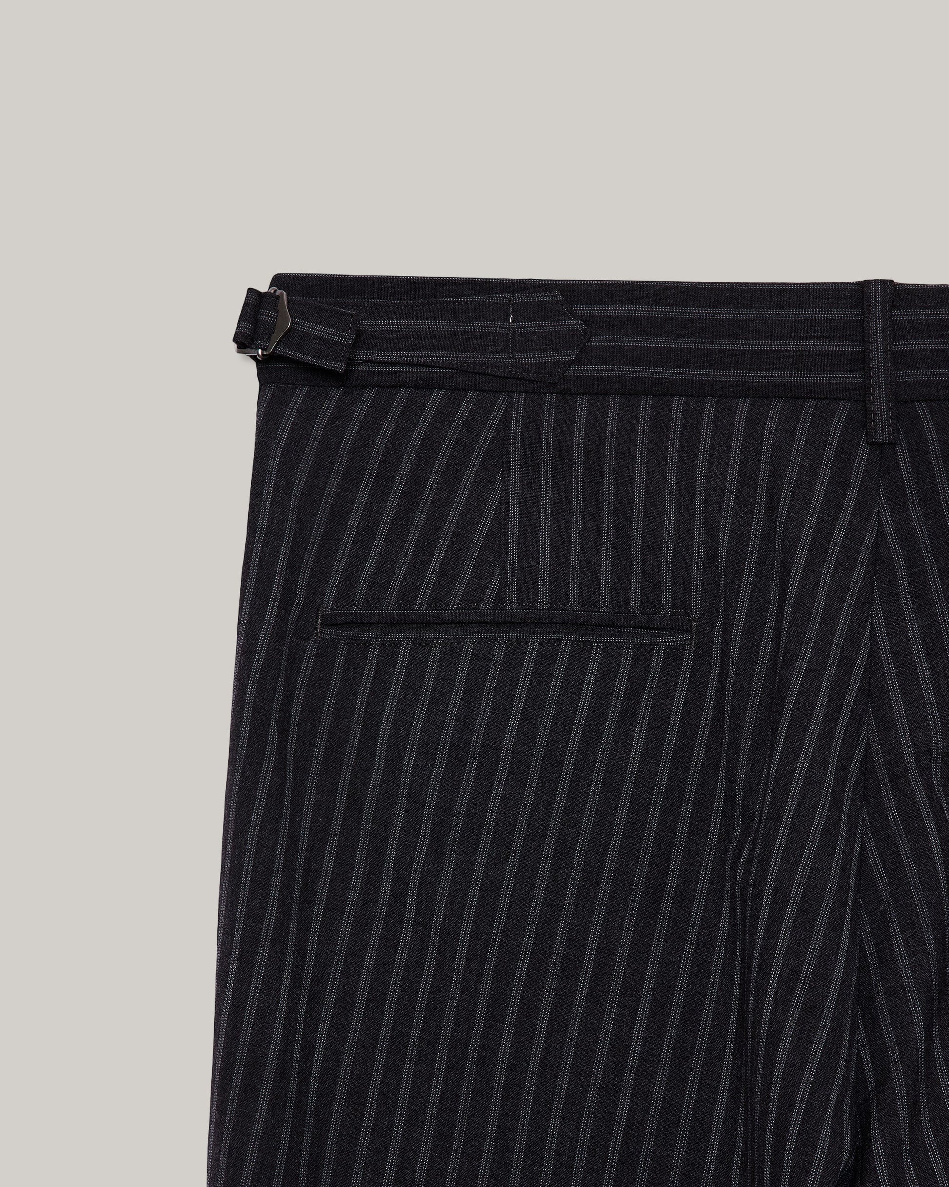 Made in their signature wool tropical wash fabric, woven in plain weave from 72-count two-ply wool yarn. Available in two colours: a deep chambray black with subtle white flecks visible within the black, and a modern grey stripe that appears solid from a distance.