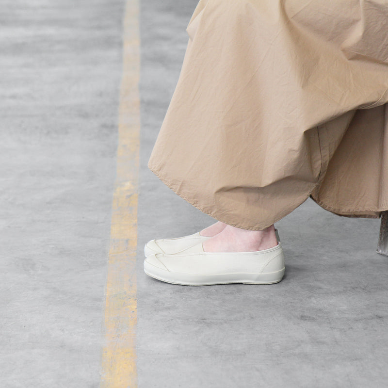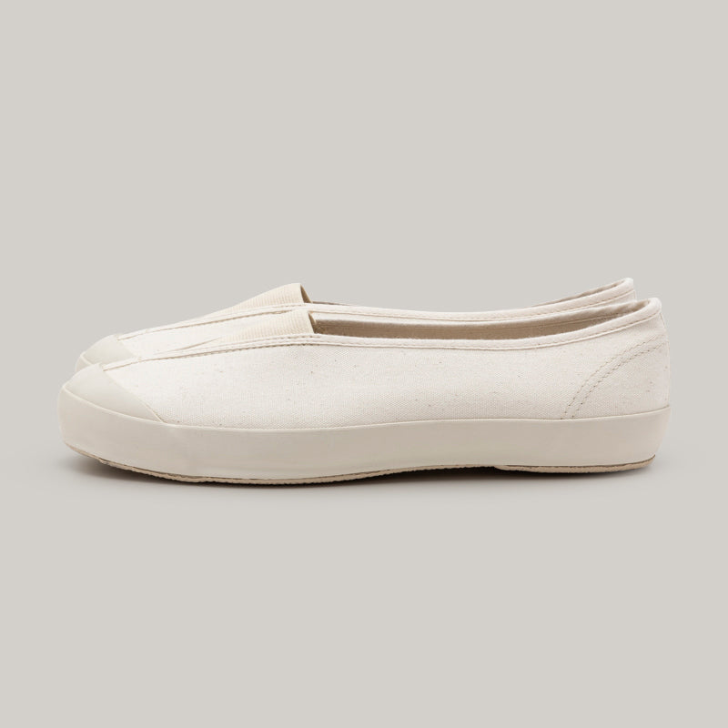 A beautifully simple ballet style shoe with an elasticated triangular insert for ease of wear. Based on the classic design of indoor gym shoes, the silhouette is slimmer and the sole is thicker.