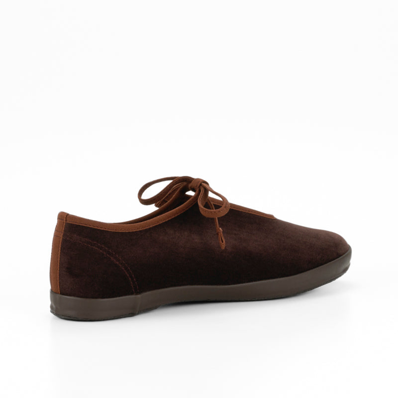 A simple pair of shoes with a single upper and piping at the opening for shoelaces. The elegant and soft form is accented with a bow.