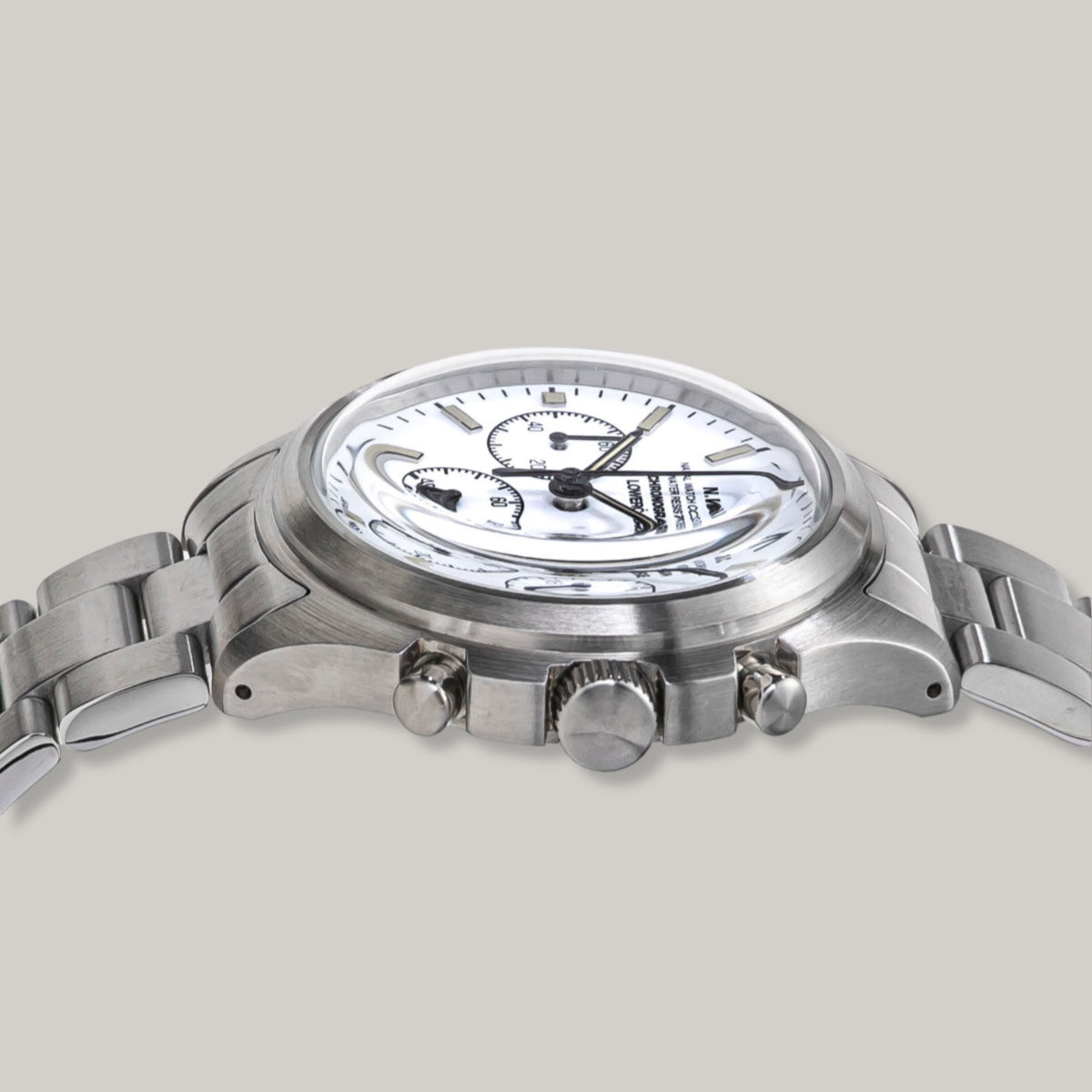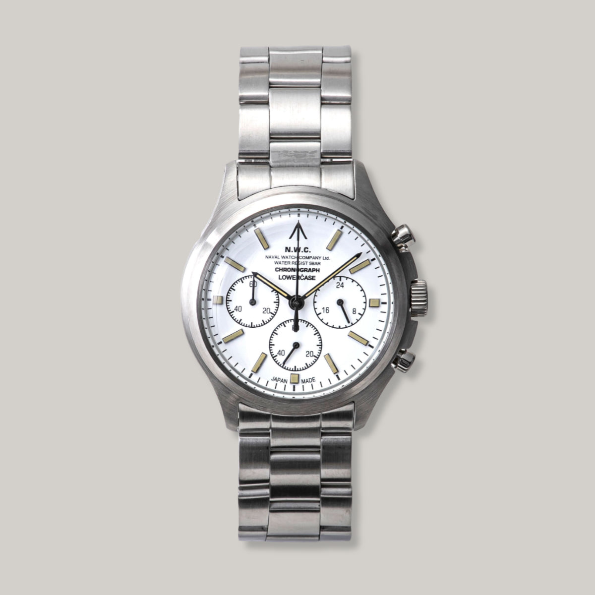 Designed with LOWERCASE, this is their interpretation of a military chronograph watch, embellished with a stainless steel band and white & ivory luminous hands.
