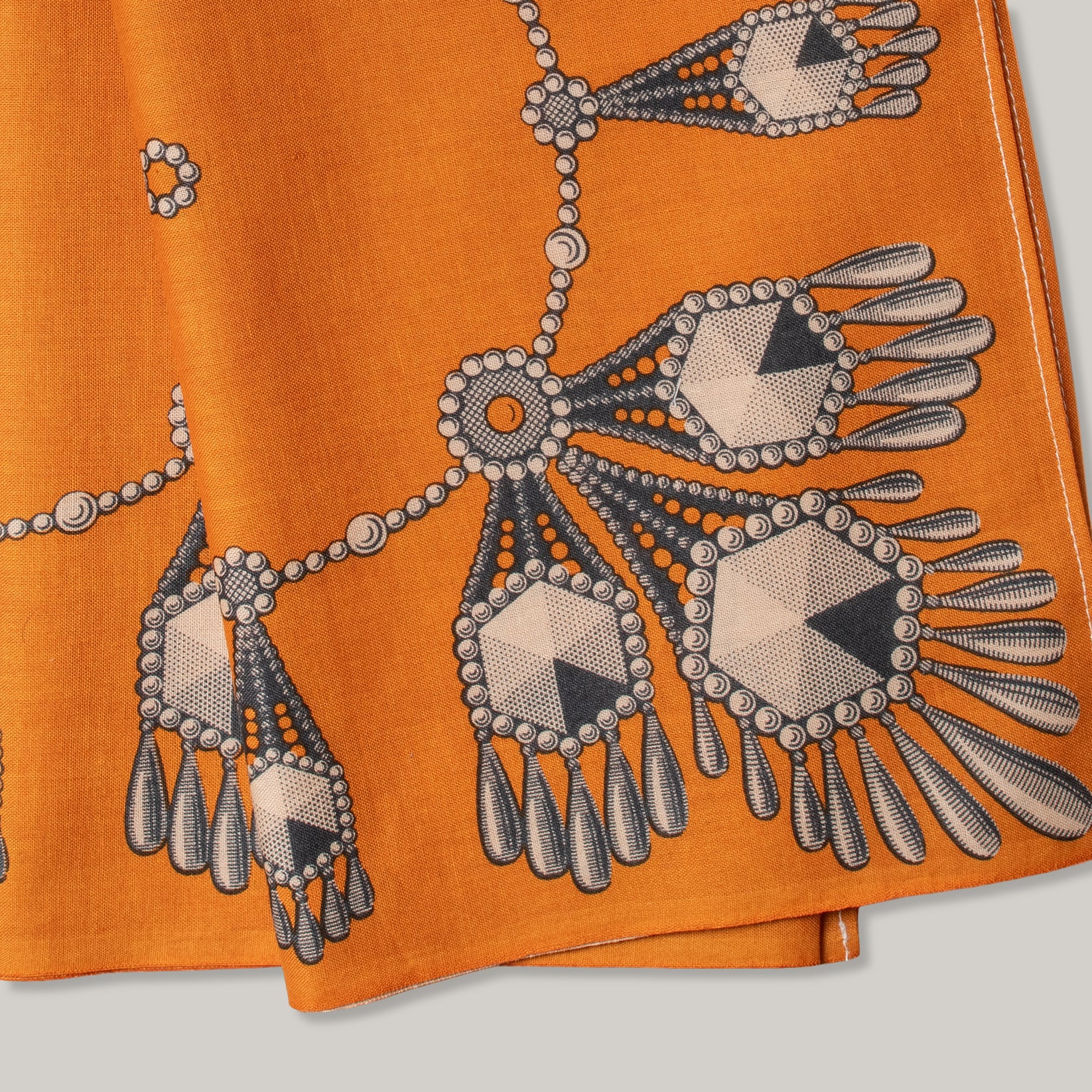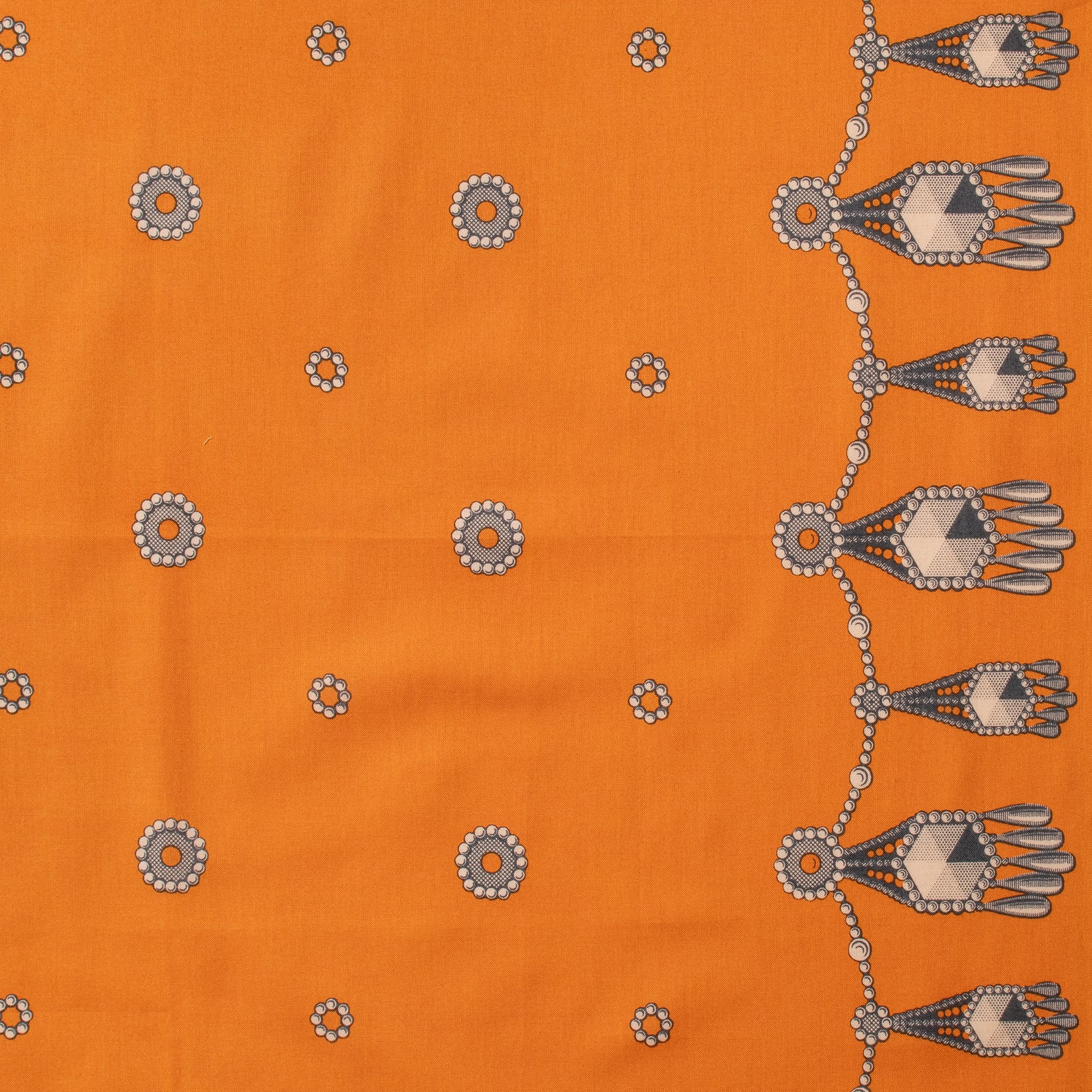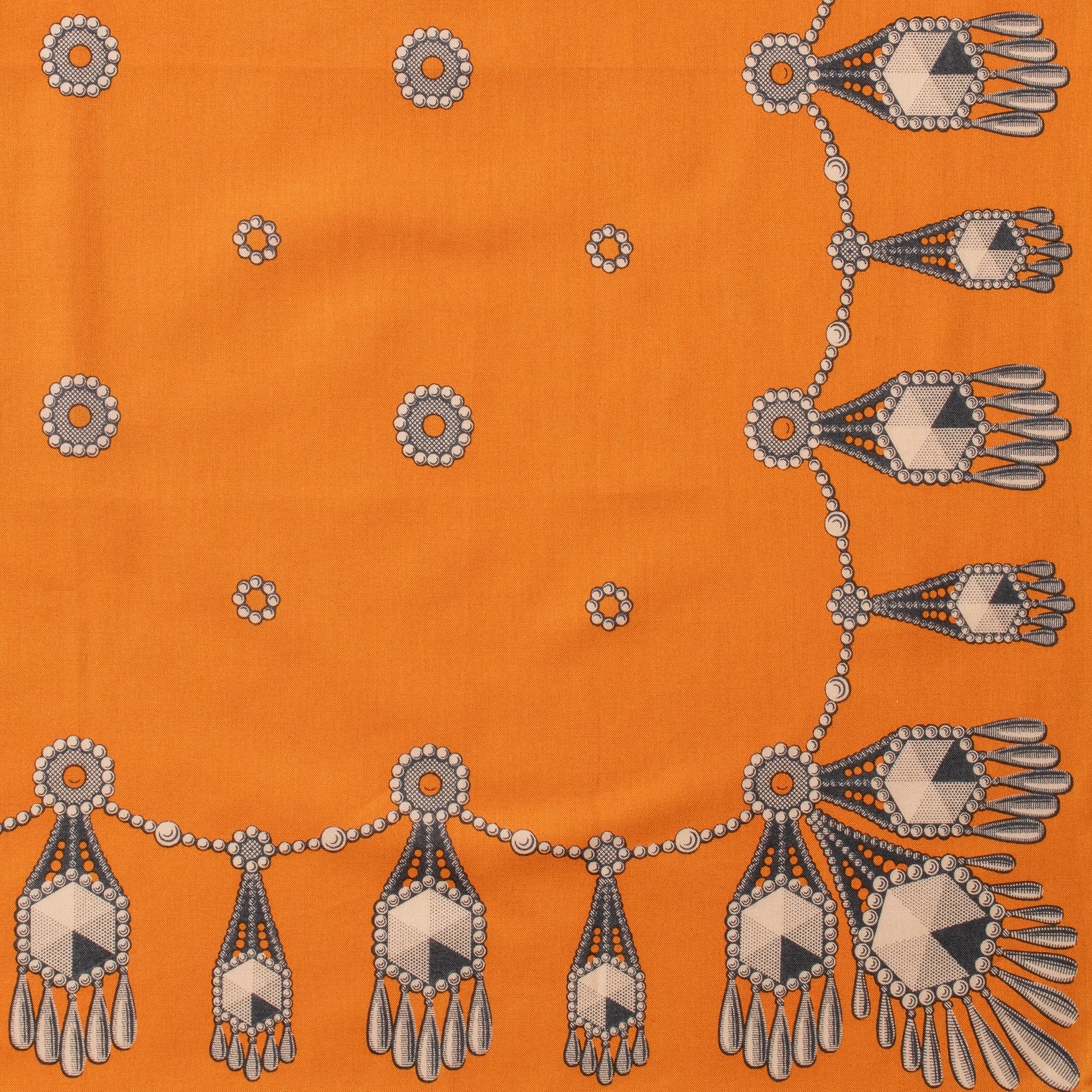 This piece is a replica from a rare unusual bandanna. Using the original colours and design, they have tried their best to replicate every detail faithfully. The orange is a great example of the popular colours present in 1920's Europe. It is hard to say where this bandanna was made but most likely it was France. France has a long history of bandana production especially in this era. The simplicity and emptiness of the design is especially eye catching. The tangerine orange is really the main engagement here.