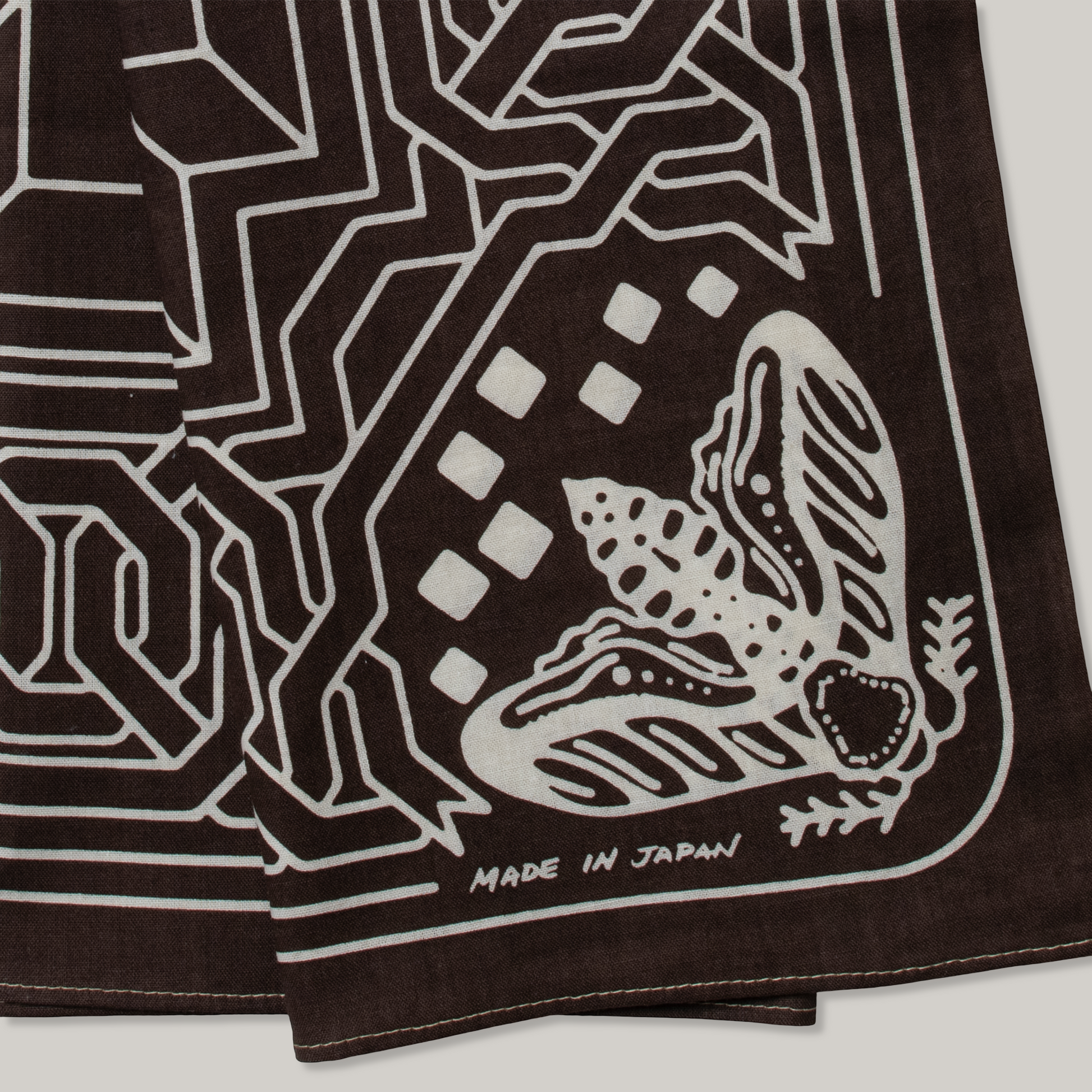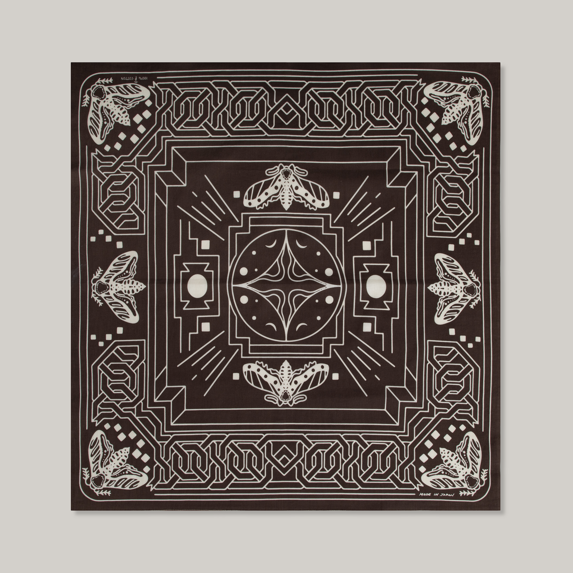 Ga is the Japanese word for moth. Alessio Vitelli and Jonathan had a short chat about updating the Nighthings design. So please take this as a sort of version 2.0 but with a new spin. Hence the new name. Drawing inspiration from vintage Turkey Red bandannas the outside border features an intricate crochet design, moths are partnered with a confetti pattern. In the centre of the design is the guiding light, blasting out from the phases of the moon and two lanterns. We really like the idea of keeping the content here realistic so have kept the colour palette dark on this. Using a sort of brown/green/black colour here. Very much like mulch. This is very drastically different from their usual designs, and for good reason, hoping to really diversify their artwork styles.