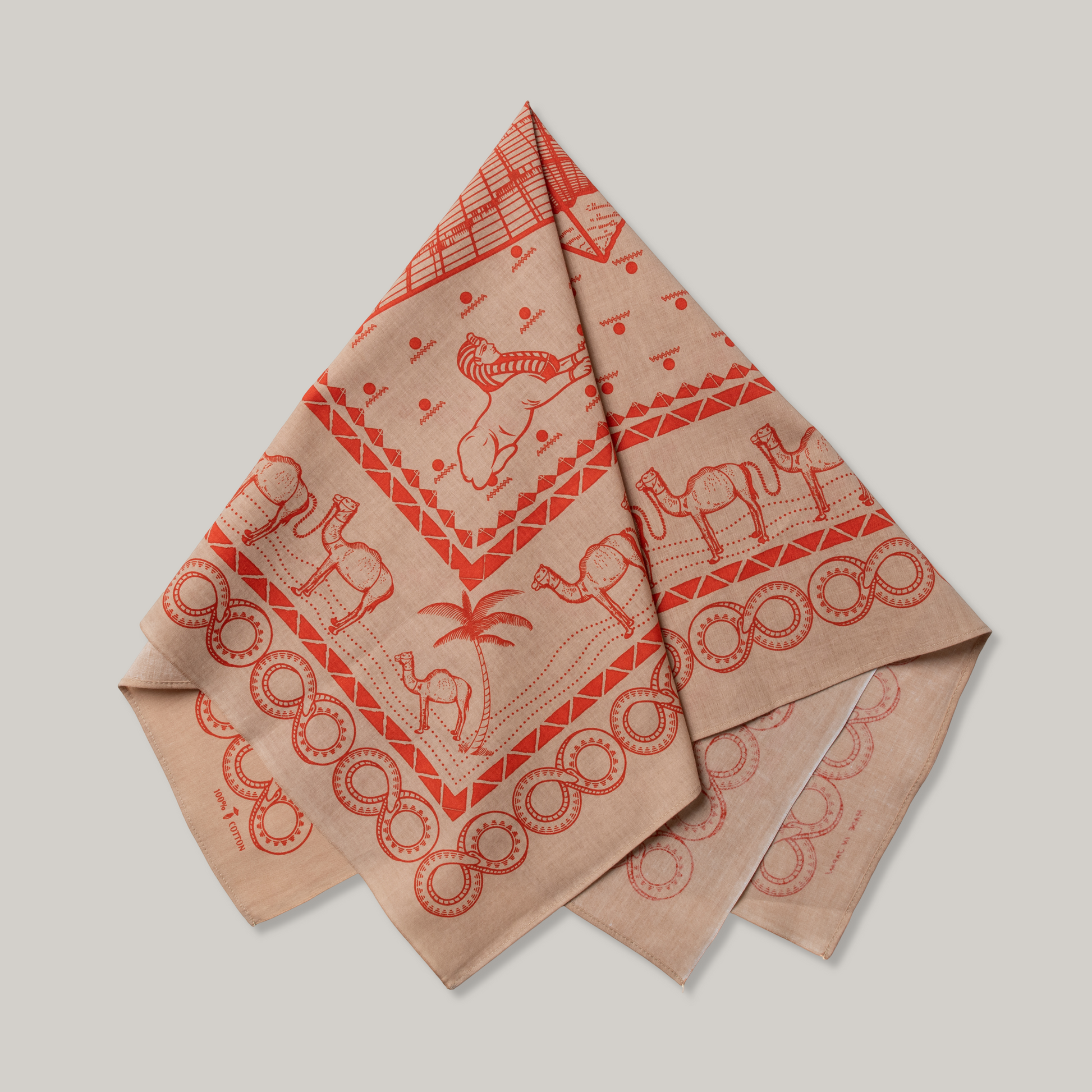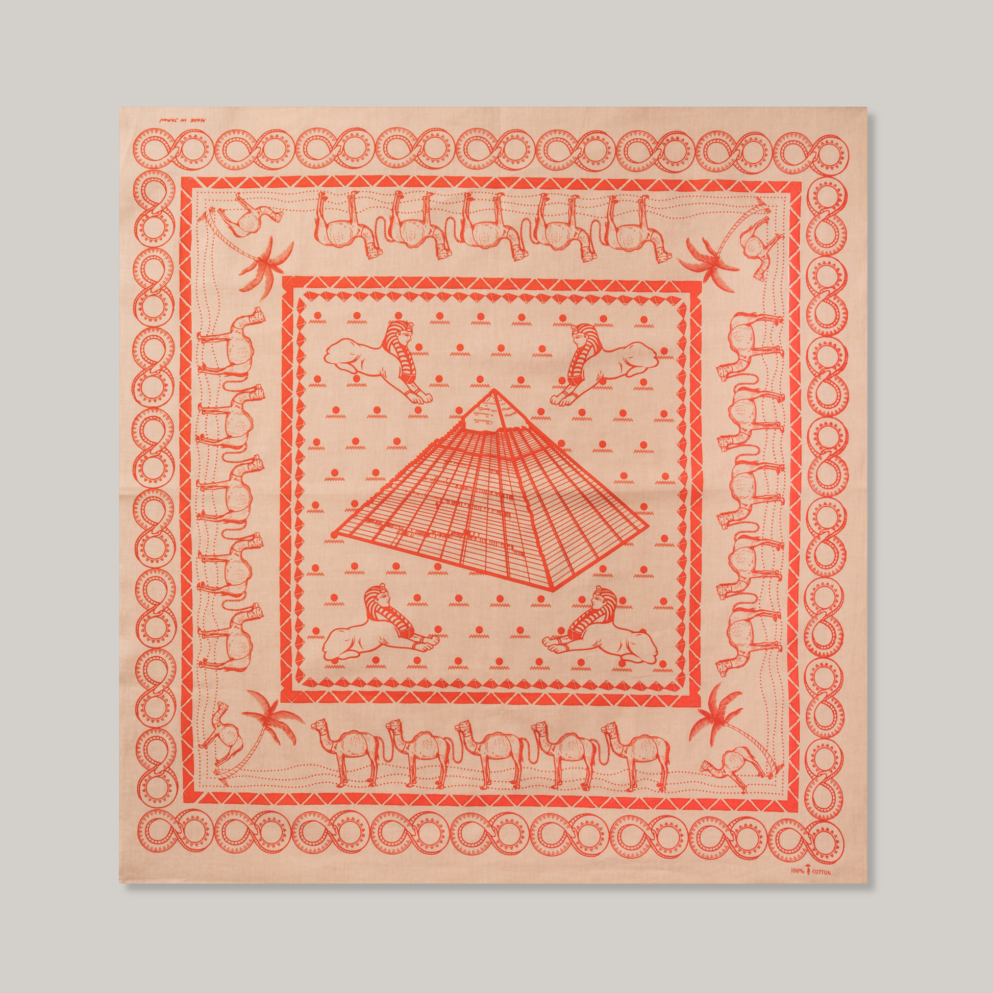 Sphinx is a design based on rodeo bandannas and modern bandannas. We have created a sort of fast colour hybrid design. Drawn by Satoshi Kaga, the author of the camel brand sticker, this design is both full of depth and however quite simple. A train of camels being led through the desert dunes, surrounded by a border of broken pyramids. On the outside edge, protecting the entire design is the uroboros. The symbol of life consuming life. While in the centre we have the sphinx in riddle form. Once again reflecting life and Mysterium tremendum. Plenty of classic symbolism and witty conjecture for people to ponder over. It also happens to look really cool with a big pyramid smack dab in the middle.