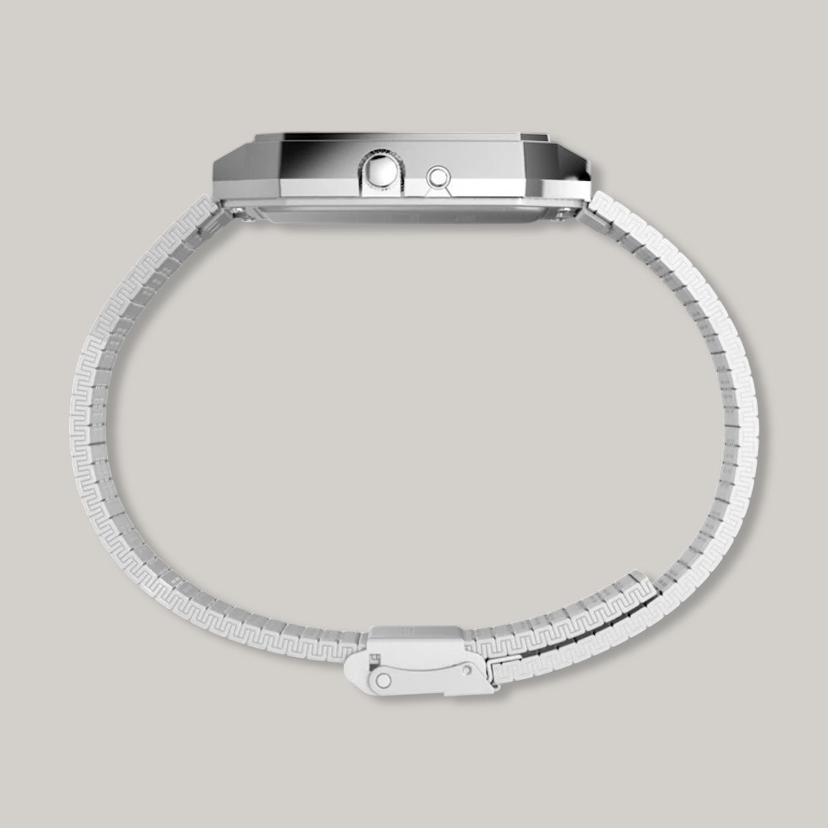 This modern-day reissue of an ‘80s classic delivers quartz accuracy with a dual analog and digital display on a clean black dial. Upgraded with a modestly sized 33mm brushed and polished stainless-steel case, it’s packed with the features you need to keep you on schedule and get you through the work week: dual time zone tracking, a chronograph, alarm, and date function. Finished with a thin handset, a polished crown and pushers, a brushed silver-tone stainless-steel bracelet, and the distinct Q Timex® logo authentic to the original, this ana-digi dress watch is a true throwback.