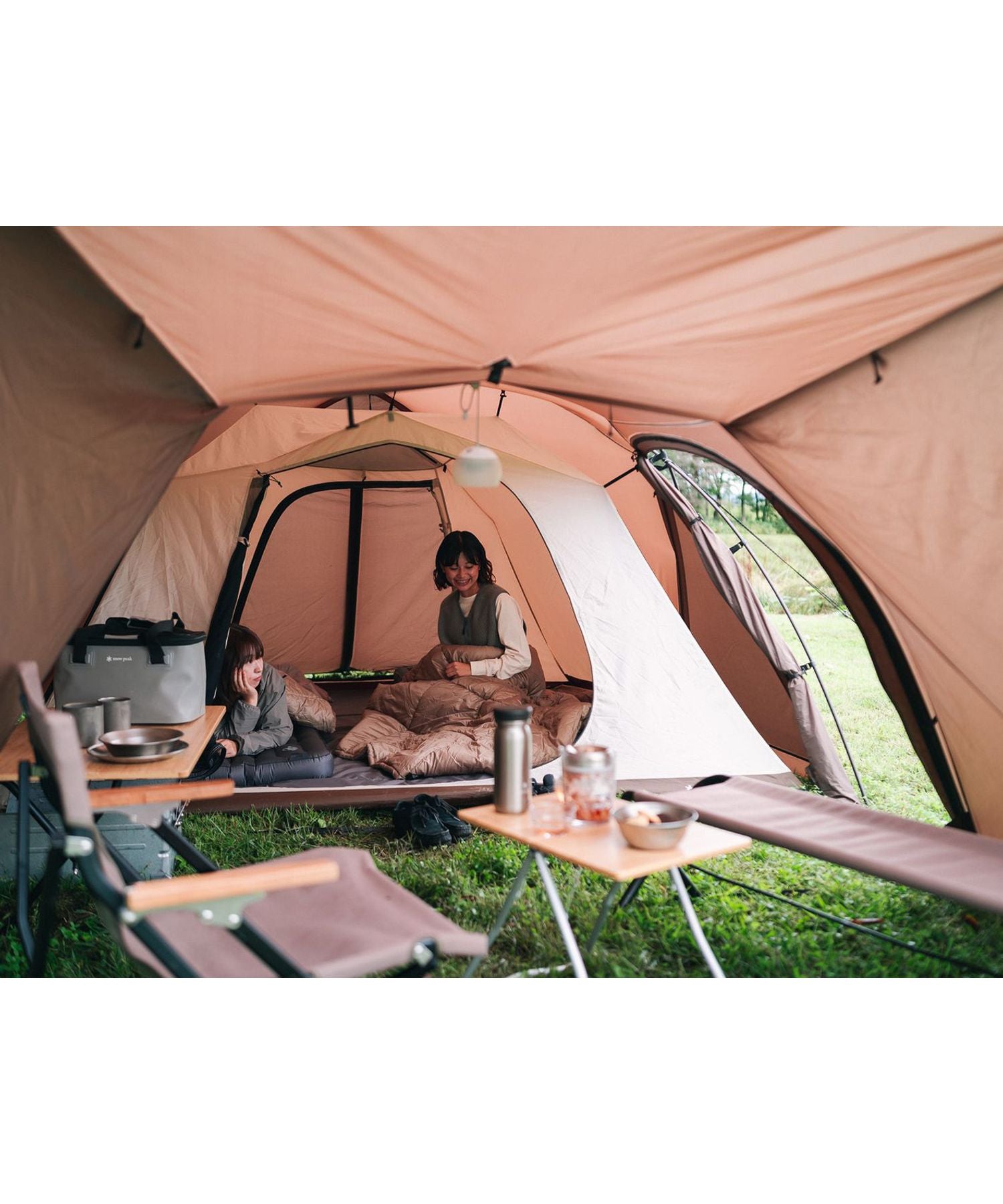 This three-person standard tent features easy setup and exceptional usability. Its spacious vestibule and mesh sides enhance comfort. Snow Peak's classic Amenity Dome, a long-time favorite as an entry-level tent, has been significantly redesigned. While maintaining its traditional wind resistance and ease of use, the new tent features a chic, natural color scheme. The flysheet and frame have also been redesigned to create a silhouette that looks beautiful from any angle. The symmetrical design of the vestibule expands its surface area and allows access from both sides. Comfort has also been improved, and the change from an inner frame to an outer frame structure allows the inner tent to be set up without getting wet, even on rainy days. Removing the inner tent also allows for use as a small shelter. Mesh panels have been added to both sides, significantly improving ventilation. The side panels feature zippers, allowing for side access. Furthermore, the vestibule features side walls, and the front panel can be flipped up in rainy weather, creating a spacious, comfortable space with excellent ventilation. The setup has also been improved, allowing you to set up and take down the tent with the inner tent still attached, and it can be set up smoothly and easily with a minimum number of hooks. As a result of reviewing the specifications in this way, the tent has been updated to meet the modern standard.