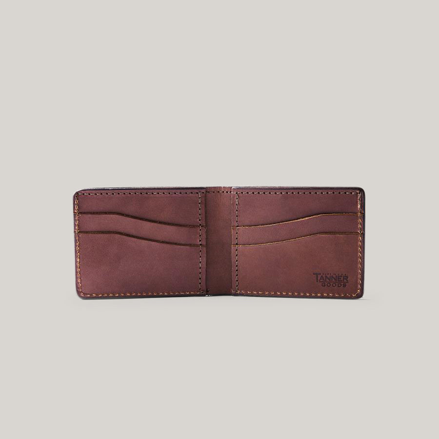 Constructed from 3.5oz. leather, the Utility Bifold features four card-slot pockets, two hidden pockets, and one lengthwise pocket for bills. Each wallet is burnished, dyed, waxed, and stamped with the TG signature maker's mark by hand. Bifold dimensions closed: 4.25" x 3.25"